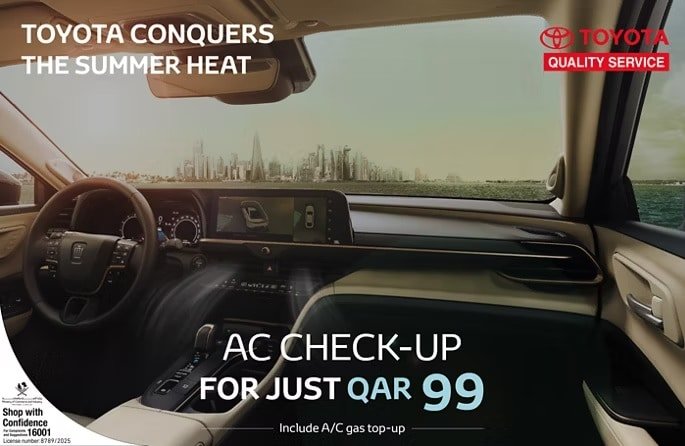 Toyota conquers the summer heat with a special AC check-up for just QAR 99, including A/C gas top-up if required. This offer is available on all Toyota models from 2008 onwards. The check-up includes performance testing, temperature and humidity measurement, and Freon gas top-up if needed. Special prices are available on parts and labor for any additional recommended work. The offer is valid from May 20th to August 19th, 2025, on an appointment basis only. Stay cool and drive confidently with Toyota Quality Service. For more information call 8001800