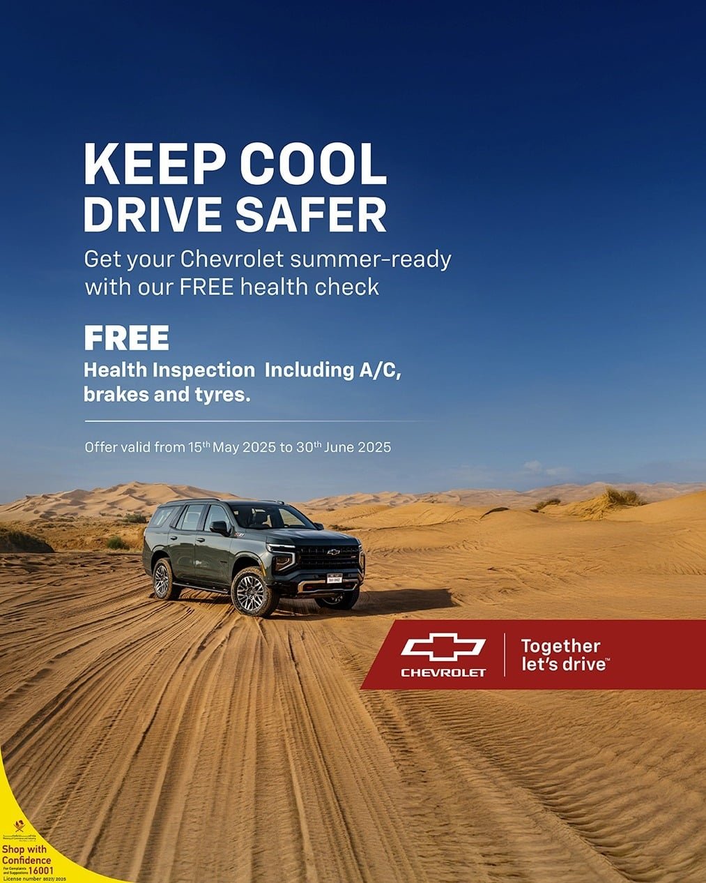 Face the summer heat safely on the road. Get your Chevrolet ready for summer with a free inspection that includes air conditioning, brakes, and tires, helping you drive safer and more efficiently. Free health check-up. The offer is valid from May 15, 2025 to June 30, 2025. Book now: 8007117.