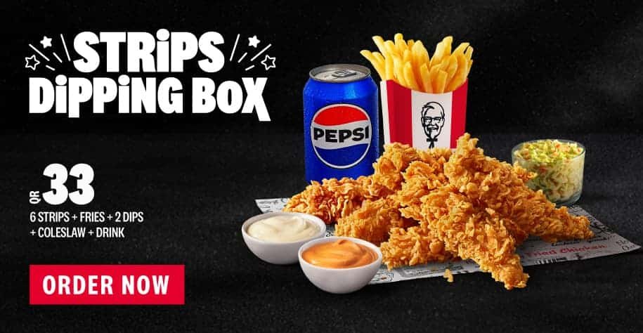 Enjoy 6 Strips, 2 Dip’s, Coleslaw and Drink for only QR 33 at KFC Qatar outlets