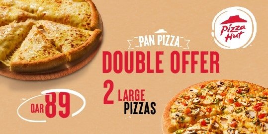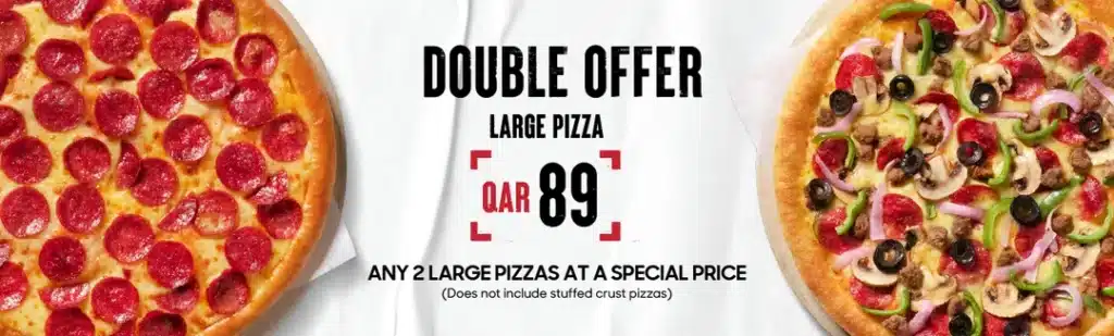 Any 2 large pizzas at a special price (Does not include stuffed crust pizzas) for only QAR 89