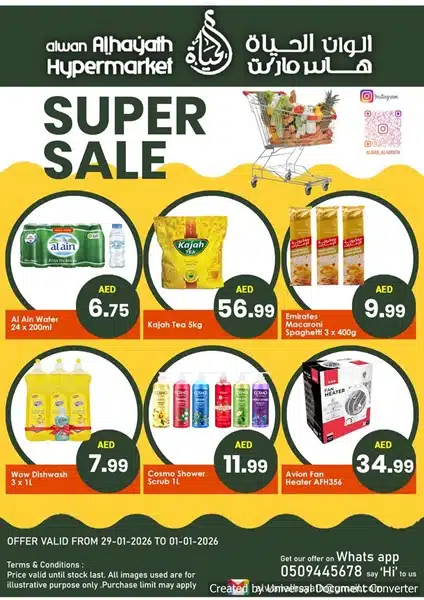 View the latest Alwan Al Hayath Promotional leaflet valid from 29 Jan to 01 Feb 2026 Alwan Al Hayath Catalog – Best Weekly Savings ↑ Click to Browse Catalog More about Alwan Al Hayath Supermarket UAE- Location & Details Follow our Channels WhatsApp Telegram Facebook Instagram Similar Offers Freshmart Satwa Big Sale February 9, 2026 Mark & Save Ajman Shocking deals February 9, 2026 Pasons Mega Saver deals February 9, 2026 Union Coop Ramadan Promotion February 9, 2026 Grand Hyper Blockbuster deals February 9, 2026 United Hypermarket Flash sale February 9, 2026